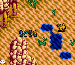 Visually, the game looks beautiful. The game has the basic sprites and animation of the typical Super Famicom RPG at the time, but the environments and characters look colorful and lively. The character illustrations pop up during the dialogue scenes, complete with eyes and mouth animation. The monster designs are unique and charming, as though the designer wanted to create a brand of originality.