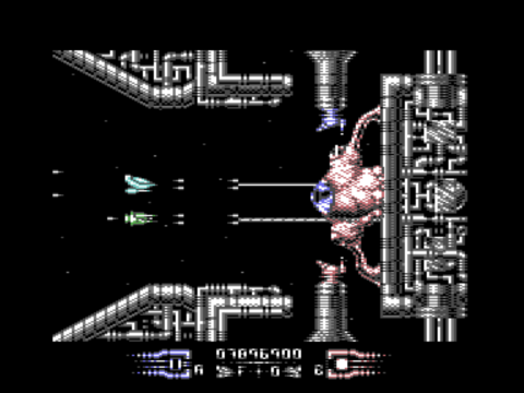 Sound-wise, Martin Walker’s title track ranks amongst the best tunes on the C64, and it is really worth booting up the game just to listen to this song. It is moody and mysterious with a memorable ‘out of this world’ vibe. The loading screens and outro music are equally fantastic and really fit the alien atmosphere of Armalyte. The in-game sound effects are very good too, the end-of-level baddies’ “machine hum” is especially nice. Most impressive is the sound of your superweapon cutting through anything, which has a nice thumping aural quality making it very satisfying to use. Given all this aural excellence, it is really a pity that Armalyte totally lacks in-game music which is probably the biggest fault of the game.