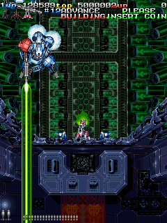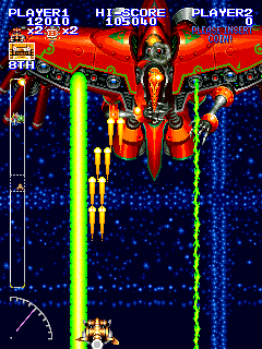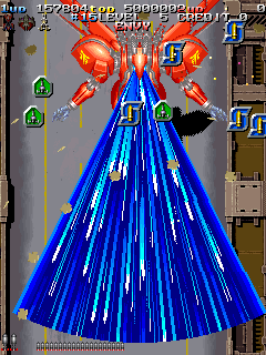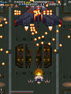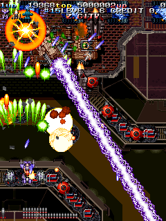 One of the best parts about Armed Police Batrider is that it tunes up Battle Garegga‘s rank system. In Battle Garegga, you start the game at the lowest possible rank and have to be careful not to let it get too high. In Batrider, you start the game at the highest rank. While it’s nowhere near as insane as Battle Garegga at the highest rank, it still fills the screen with bullets and will try its very best to kill you unmercifully. There is one catch, though – you can way to lower your rank by grazing. This is when a projectile passes through your sprite, but misses your hitbox. It can be very good for scoring, as it gives you extra points, but it’s obviously also very risky. By lowering the rank, grazing can be key to your victory.
