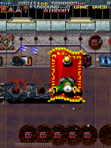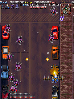 There are other methods taken to try to make Armed Police Batrider easier and more accessible to new players. There’s a training mode that features slower bullets, less levels, weaker bosses, and an auto bomber attack. Normal mode is quite a step up in difficulty, and Advance mode adds in the final level and is the only mode that offers endings. There is one last mode called Special, which is a boss rush mode where your ship is always at full power. Arrange mode can be enabled through a dip switch, letting you mix and match levels, just like in Battle Garegga. Sadly, your customization is far more limited. You only get to choose what order you play the airport, sewer, and sky levels while the rest of the game is untouched. If arrange mode is off, then the order of those three levels are randomized.