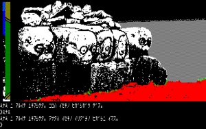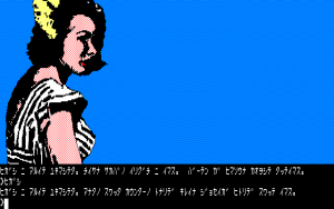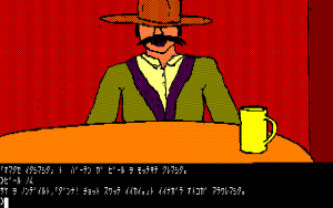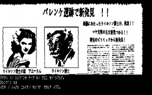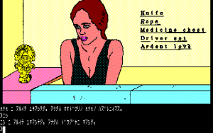 In many ways, it’s a typical entry in the text adventure genre – solving obtuse puzzles and wrestling with the text parser. (Unlike Hudson’s text adventures, which used English input, Falcom’s are entirely in Japanese.) There are a few unique aspects though – though some of the visuals are presented with the standard computer drawn graphics (lots of straight edges and simplistic coloring), some areas use monochromatic digitized photographs. It creates an extremely inconsistent look, especially since some humans are drawn one way and others are drawn another. Some of the villagers also have green skin tone, so they look like zombies, even though they aren’t. Curiously, there are also a couple of nude photographs of women to find, even though the game otherwise doesn’t have any erotic elements.