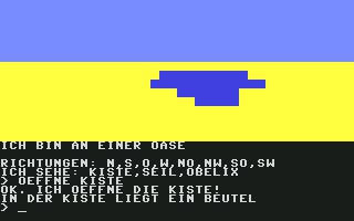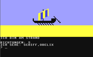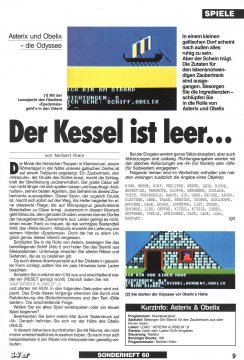Asterix und Obélix: Die Odyssee (Asterix and the Black Gold ) was released as a free game that came along with the April edition of German C64 magazine 64’er in 1986. The game is a text adventure that follows the adventures from the book of the same title.