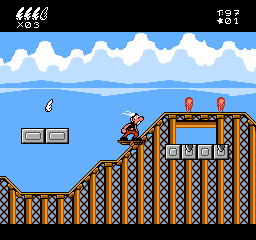 The NES version takes a page out of Sega’s book and returns to the more simple and colorful look of 1991’s Astérix on the Master System. The locations are vibrant, the mood is more upbeat and the punch has thankfully a wider reach. You visit four acts, which take you through Gaul, Helvetia, Spain, Egypt and Rome, with each having 3-4 levels within them. Each of these worlds offer staple hazards from the platforming genre with ice making you slide, boulders crashing down on you and massive amounts of fire jumping around the ground for you to avoid. The enemies range from Romans to Egyptian soldiers, but the majority of enemies you face are actually from the animal kingdom – sparrows, piranhas, snakes, spiders and, of course, wild boars. It might sound like this game is going in the same direction as Astérix and the Great Rescue, but in reality it’s actually quite fun…and damn funny, in fact. It’s aimed at younger gamers so the difficulty isn’t suffocating, but it still packs a challenge with some good level designs and accurate controls to guide you along. On all the stages you’ll find big A blocks which can be punched in order to get stars for points or other secrets. You can also find a magic potion bottle which gives you invincibility for a short run. After each act, you also got a bonus round, which is either you breaking barrels thrown at you by a pirate, or log rolling at sea. There aren’t any bosses to be found outside of the last boss, Briseradius.