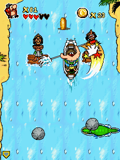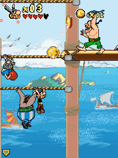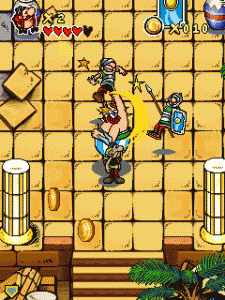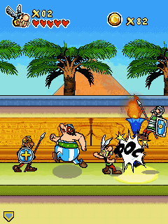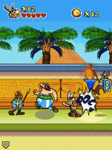 Similar to the other games by Gameloft like Chuck Norris: Bring On The Pain, Astérix & Obélix chez Cléopâtre is a platform game using small scripted events and simplified controls throughout an impressive 11 levels, taking you from the snowy winter of Gaul to the roasting sun in Egypt. The game follows the events of the source pretty closely, as each level usually relates to a specific scene with some expanded elements to allow for more interesting level design. The stages are filled with Romans and sometimes even have multiple routes. To get through the stages you will need to use both Astérix and Obélix to overcome some puzzles or roadblocks, playing to their different strengths. While the majority of the game is a standard 2D platformer, there are also certain levels that involve boating with down the river from an overhead perspective, and free roaming fights against enemies. The controls for the co-op parts are flashed on screen when you reach the moment where they’re is needed. The only real thing taken from the In Fusio titles is the pre-stage briefing of items which you can pick up and be rewarded a 1-up if achieved. Magic potions can also be picked up for temporary invincibility.