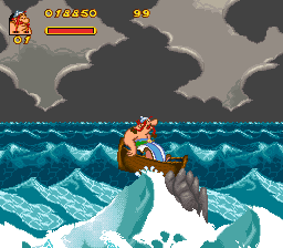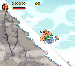 Development duties were given to Bit-Managers, who had already been responsible for the NES and Game Boy versions of 1993s Astérix. Bit-Managers had a good track record on Game Boy where most of their games would see a release, but Astérix & Obélix would be their only effort on the SNES. It’s a rather long game with 27 levels and 16 mini-games of many kinds, though most of them rely on the same mechanics used in-game. The progress of the game is what had been established with the majority of the earlier Astérix games, a voyage through many countries with different environmental hazards appropriate for its climate. The game allows for 2 players simultaneously, a first for a console Astérix and a sorely missed feature since the arcade game. The only major difference between them is the size and speed of their movement and attacks, but none of them have any individual skills. Many refer to this game as a port of the arcade game but other than co-op gameplay it bears little resemblance and do not have any connection outside of being of the same license. Sadly, despite offering a real 2 player mode and some impressive graphics for SNES, it’s a quite bumpy ride getting to Rome. The controls have some delay to them, which makes the fighting tedious, and it continues the strange tradition of making the heroes uppercut straight up, limiting your reach significantly. Worse yet is that the majority of enemies you meet can attack you from a distance while you have to be right by the side of them, leading you to take first damage most of the time. Obélix also controls so slowly that despite being the default choice, there very little reason to play as him.