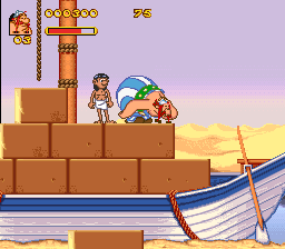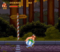 The strangest part is the naming of the game, Astérix & Obélix. Sure both characters are featured and indeed you can play as both, but the game was marketed and clearly shows a favoritism towards Obélix. By default you start as him, the intro shows him goofing around and his logo is three times the size of Astérix’s logo on the packaging and even in the game itself. It gets even more puzzling as all the ports and releases that game after the initial SNES and PC versions are named just simply Obélix in-game, but the packaging still reads Astérix & Obélix. This might have been done because of sales concern by just marketing Obélix but especially in the case of the portable version, it gets confusing why the titles differ.
