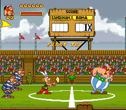 Items and points are scattered around the stages in true platforming fashion. You can pick up stars for points, and depending of your choice of character, you can also obtain a magic potion/roasted boar for temporary star power. What sets this game apart from the others is the high number of bonus stages you will encounter. After almost every other level or so, there will be some kind of bonus stage such as playing rugby or running in the Olympic games. While it offers a much needed breather from the standard action found in the game, they all base themselves on the same mechanics you already use on the normal stages for the most part. A few of them require some button mashing and other styles of control, but for the most part it’s all about jumping and punching which makes it more of the same. It’s not horribly executed, and to its credit most these stages work well, but they just don’t offer enough to keep the game from feeling a bit redundant if you’ve already played any other platformer.
