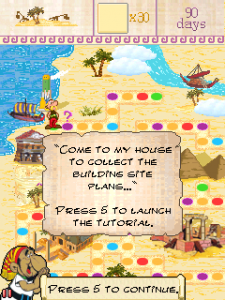 Over the board, you can land on either mystery squares or mission squares. The mystery squares will bring you either setbacks or rewards, with the rewards being magic potions that send you directly to your goal, or extra turns. The mission squares will make the player do one of many different deeds to help the Egyptians building their pyramid, like shooting, fighting Romans, chopping stones or jigsaw puzzling. Once you use up your 30 turns, the game is over, while winning missions will award you more turns.