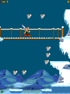 The game is just a simple reskin of the prior cell phone title, bearing only aesthetic differences with all the same functions. Rocks have become barrels or snowballs, coins have become skulls and Romans are now Vikings. The only new addition is the danger of seagulls crashing into Astérix, and trampolines. There is also an end boss to this game, Olaf the Viking. It’s still a barely controllable affair, though maybe with a bit more novelty by being the only game adaptation of the animated movie.