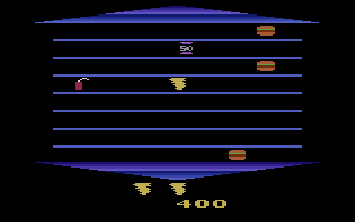 The first Astérix game is not really a true Astérix game, however. Seasoned Atari gamers will probably already have gazed on the screenshots and feel they look awfully familiar. That’s because this game was released earlier under an entirely different title, that being Taz, based on the Looney Tunes character. In that game Taz must avoid bundles of dynamite while picking up hamburgers. Other than the sprites, there are no differences between the two games. Both Astérix and Taz could be seen as variations of Turmoil, another Atari game with quite similar gameplay released one year prior. It’s actually decent in its own right and provides some of the classic instant gaming fun that the Atari 2600 is famous for.
