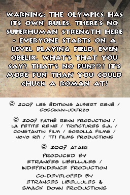 It was once again time for Astérix to go back into the world of live action with the release of Astérix aux Jeux Olympiques (Astérix at the Olympic Games), being released into theaters across Europe in January 2008. Even though the second live action movie had skipped on having a video game tie-in (with the movie being based on Astérix et Cléopâtre) probably due to the rebranding of Infogrames during the early 2000's, the opportunity to cash in on the Beijing Olympics proved too tempting for Atari. For the 3rd time, étranges Libellules would lead Europe's favorite hero into an all new arena.