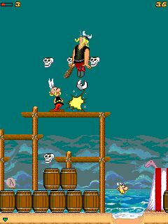 The game is just a simple reskin of the prior cell phone title, bearing only aesthetic differences with all the same functions. Rocks have become barrels or snowballs, coins have become skulls and Romans are now Vikings. The only new addition is the danger of seagulls crashing into Astérix, and trampolines. There is also an end boss to this game, Olaf the Viking. It's still a barely controllable affair, though maybe with a bit more novelty by being the only game adaptation of the animated movie.