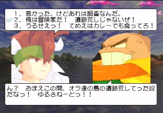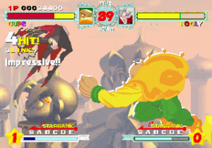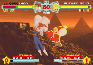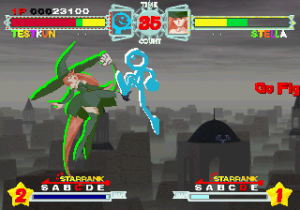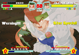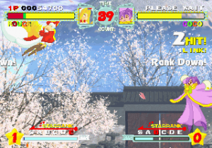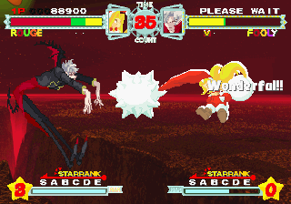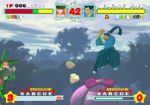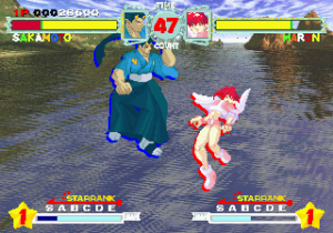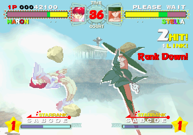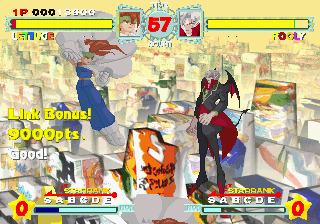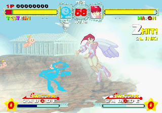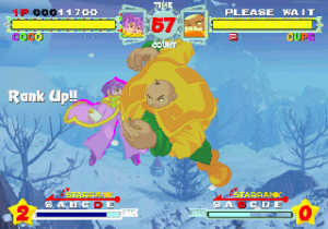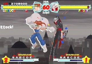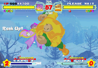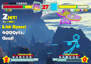 Although all characters can block, all defenses can be easily guard crushed, which makes dodging all the more important. The system promotes aggressive gameplay, since characters regain small portions of their life when not being attacked (similar to Vampire Savior), and you’re graded during battles on your performance, which affects the judgment if the time runs out. The fighting’s all a bit simplistic and more than a bit spastic, but it’s still a ton of fun watching everything in motion. The character sprites are mostly colored with pastels, and stretch like elastic when getting hit. The backgrounds are generally kind of boring, except for two stages set against the ocean, with almost photorealistic scrolling water.