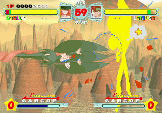 Sunsoft’s third and final fighter (although it was technically developed by a company called Santa Claus) is quite unlike its predecessors – or any other 2D fighter, for that matter. In Astra Superstars, all of your characters are fighting in mid-air, like in Dragon Ball Z. In spite of this change in dynamic, the gameplay is somewhat similar to Waku Waku 7. Astra Superstars still uses a bright and colorful art style, although it trades the manga/anime influence in favor of clean and simple designs that seem right out of a children’s book.
