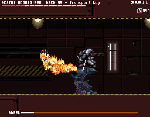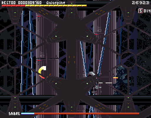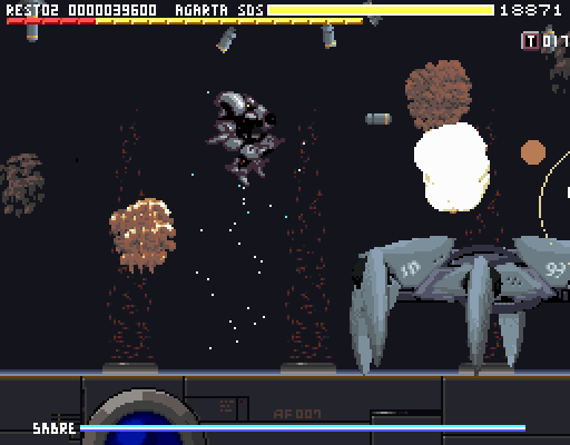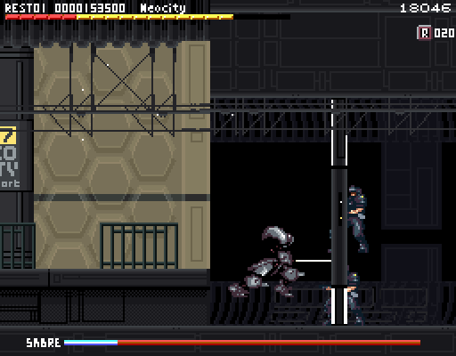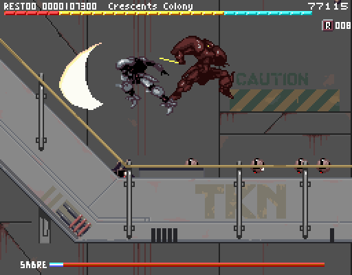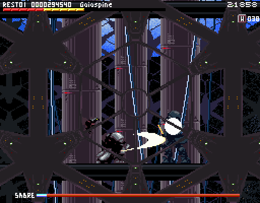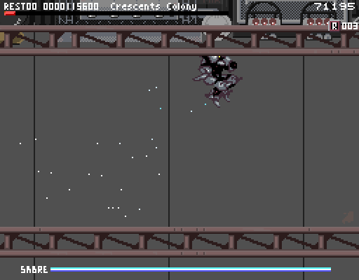 Even in its lowest moments, Astrocounter of Crescents delivers consistently on visual pizzazz. While the game technically runs in SVGA mode, the actual gameplay screen estate is comprised of 256×200 pixels, with only character portraits and fonts displayed in higher resolution. Nevertheless, the spritework is ace, showing off fancy programming tricks that recall Treasure games (including their trademark multi-segmented boss). There isn’t much variation in level theme, mostly set in night or dim interior, but its muted gray palette suits the gritty, somber nature of the game. The enemy mechas have stylish design, and everything Bulgidung slashes through makes a striking explosion littered with abstract particles (though reportedly, there were complaints that its excessive special effects caused ungodly amount of slowdown in underpowered hardwares).