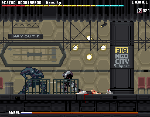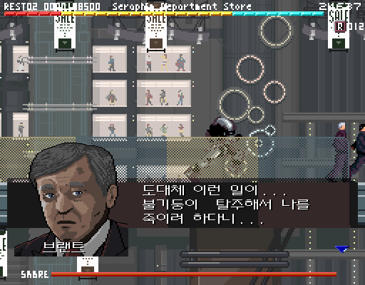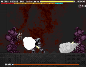 The awkward control scheme takes some time to get used to, and it doesn’t help that essential gameplay mechanics are hidden to the player, unless you can understand Korean and read them up at (now defunct) official website or the game’s manual. Holding an attack button charges the Sabre meter at the bottom of the screen. Once it maxes out, you can release the button to unleash a stronger blow that has longer reach, but taking damage will reset the meter. Every defeated enemy drops a spread of small capsules called Cells; these are used as ammo for your sub-weapon, but their real potential lies in temporarily boosting your sabre. Hit your opponent with a Cell in-between, and your Sabre meter instantly charges up, performing it as your follow-up. Do the same with fully charged sabre, and you can execute a special move called Double Smash that causes even more damage. You can also block all and any attack aimed at you by promptly moving away from it; pressing the attack button again at this point will let you counter.
