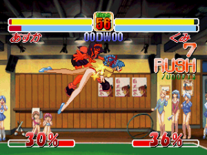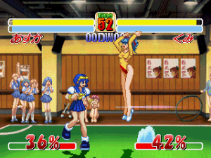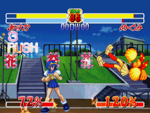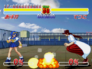 The combat system of Asuka 120% was based on the mecha beat-em-up Mad Stalker, an earlier game by Fill-in Cafe for the X68000. Designed and programmed by Masatoshi Imaizumi and Masaki Ukyo, this style was the source of a number of other similar games developed between the duo, including Fill-in Cafe’s own Panzer Bandit, Treasure’s Yuu Yuu Hakusho: Makyou Toitsusen and Guardian Heroes, Studio Saizensen’s Code of Princess, and 5pb’s Phantom Breaker: Battle-Grounds. It’s also similar to Makeruna! Makendou 2, another cutesy 2D fighting game, whose PlayStation port was developed by Imaizumi. (The original Makeruna! Makendou, a 2D side-scroller, was released for the SNES in America under the name Kendo Rage.)