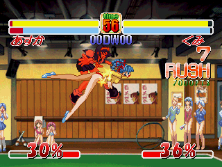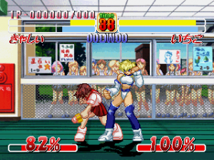 While it may have seen like a cynical ploy to capture the audience of the burgeoning bishoujo game market, it’s also an incredibly well made game, with many innovative elements that were re-used in later fighting games. It’s very fast paced and combo heavy, with double jumps, the ability to cancel out attacks by executing another move, and other techniques featured in later fighting games, particularly the Guilty Gear games. It’s also fairly approachable, with simple controls and universal command inputs across all of the characters. The “120%” of the title refers to the maximum level of the super meter, which, as is standard, allows the fighters to execute super attacks.