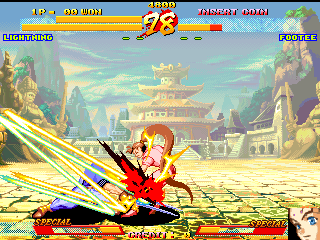 A very effeminate man who wields two swords at once. He has strong lightning based attacks and good air combos. He is not present in Asura Buster, being replaced with Leon, who has Lighting’s weapons, but is the same only in appearance.