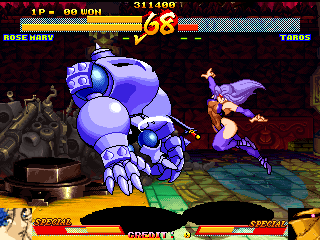 Taros is a powerful blue golem that is based on Talos, a golem from various legends. Taros is a very good character for beginners, as he is very large, does lots of damage, and has easy combos. His attacks look cool, as he can turn the bottom half of his body into an axe, fly by spinning his legs, and shoot a hidden laser in his head. In Asura Buster, Taros turns gold and is much faster but loses some of his strength. He is still easy for beginners to learn, but not the same character.
