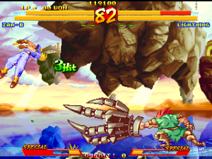 One of Asura Blade‘s more interesting features involves how it handles special moves. All characters have a pop-up attack that throws the opponent into the air and is good for setting up combos, similar to the Marvel Vs. games and Guilty Gear X. All special moves have a strong, medium, and weak version. For example, if you perform a quarter circle forward with Goat and press strong attack, he pulls out his mace and swings it very slowly. If you do the same motion and hit the weak attack, however, he swings his mace much faster, but it does less damage. Asura Blade adds in something called EX attacks, similar to those found in the Darkstalkers games. They take up around half of your super bar and are performed by doing an attack motion, but hitting two buttons at once. This can make move pools seem much larger by comparison, even though most characters only have one to two super moves.