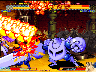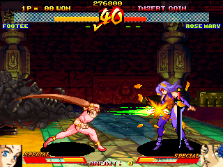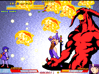 Rose Mary is a powerful sorceress with a demonic sword. Her sword floats alongside her and can transform into different colored demons. She has almost the same move set in both Asura Blade and Asura Buster. In Asura Blade, Rose Mary looks fairly normal next to the rest of the cast, but in Asura Buster, she gained much larger breasts and a more seductive walk, probably to pander to her fans.