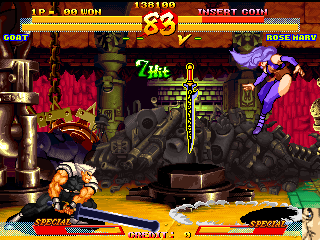 Another interesting feature is the ability to fling your weapon by pressing all three attack buttons at once. By throwing your weapon, you get a ranged attack that does a lot of damage at the expense of being unarmed. Most characters play completely different unarmed, Goat being a particularly good example as he no longer hits hard, but he becomes very fast. You can pick your weapon back up by simply squatting down and hitting an attack button. It’s a pretty cool feature that can add a lot of depth to the game, moreso than Samurai Shodown, which had a similar feature but didn’t change the characters so drastically. The computer apparently does not know how to toss their weapon, though, because it never does this.