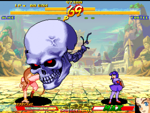 Alice is the strongest necromancer in the world, who also happens to be a child. Like Zam-B, she is small, so hitting Alice with high attacks can be a problem. She does take extra damage, which is hardly an excuse for her having such powerful attacks. In Asura Blade, Alice fights with a crew of zombies and skeletons that simply come out of the ground to help her. In Asura Buster, she has a skeleton familiar following her around that can fight for her through a command.