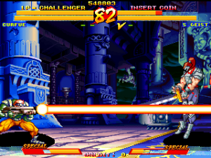 The boss of Asura Blade. S. Geist wields a living sword that strongly resembles the Ivy Blade from Soul Calibur, the Asura Blade. S. Geist does not do much damage on his own, but his combos are insane and he does not even have to move in order to use them. Fortunately, he is much easier to defeat than Curfue and can only be playable through a secret code.