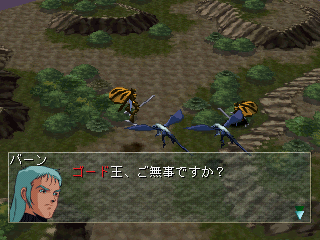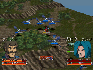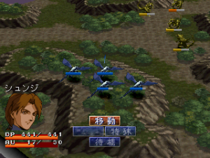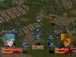 The strategy-RPG sections are similar to games like Shining Force. The polygonal backgrounds are divided into grids, with sprites representing the units. When engaging in battle, it switches to a 3D animated sequence showing the two fighting each other, though these can be switched off to save time. As you win battles, your squad gains experience points, and gains money that can be used to upgrade your units.