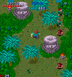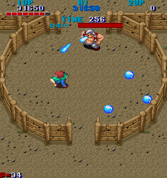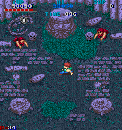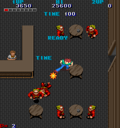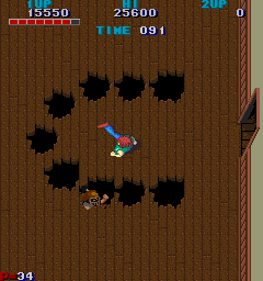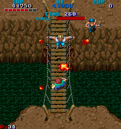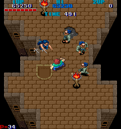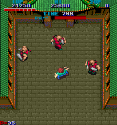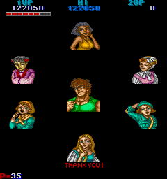 The game takes place in Paradise City, whose peacefulness has been ruined by the evil Geshita and his gang. They’ve kidnapped not the hero’s girlfriend, but six women from city, who must be rescued by the heroes, Ryu and Kou. There’s actually a unique portrait for each of the hostages (though none of them are named). The game begins in the street of the city, moves to the Chinatown district, then goes through various outdoor settings (a canyon, a jungle) before moving to the castle-like headquarters of Geshita. The game was directed by Takashi Nishiyama, who later on to create Street Fighter, though at this time was known at Capcom for games like Trojan, which has a similar thematic level progression.