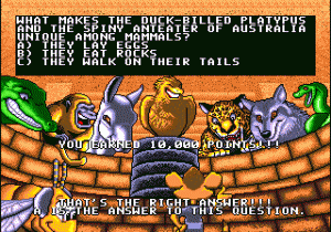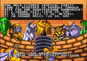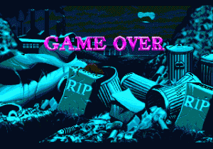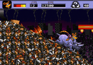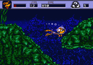 What makes Awesome Possum a truly surreal experience, however, is the bizarre grafting of environmental issues onto the game. The equivalent to Sonic’s rings in this game are recyclable bits of trash like bottles, cans and newspapers, and different stages of the game represent different environmental issues; the rainforest, the ocean, the Arctic circle, and a massive landfill, respectively. (At least there’s no mine cart level.) Between each stage, for seemingly no reason, you’ll be confronted with a multiple choice question about some environmental factoid. Get it wrong, and nothing happens. Get it right, and you earn bonus points, but since points never actually amount to anything remotely beneficial, it’s about as good as if nothing happened, unless you were just dying to know how long blue whales could hold their breath. Driving the point home that the environment is important, the game over screen is the stuff nightmares are made of.