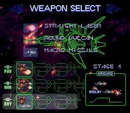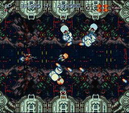Axelay is much more than just fancy graphics and sounds, though, as its genius can be traced to its weaponry system. The ship’s offensive abilities are divided into three systems — primary, secondary, and missiles — which are cycled through with the L and R buttons. At the beginning of each stage, you pick which weapons to equip in these slots. The primary weapons include the Straight Laser, a standard powerful shot; the Needle Cracker, which fires many small lasers that track enemies around the screen; and the Wind Laser, which shoots an array of four lasers across the screen.