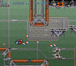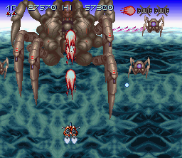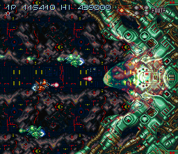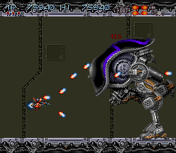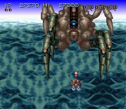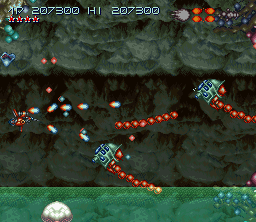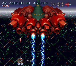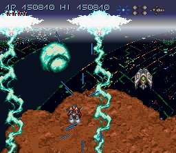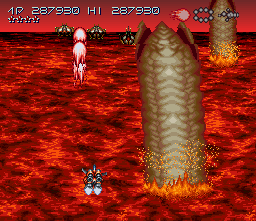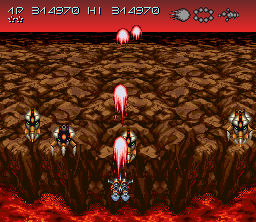Much of the atmosphere is aided by the fantastic soundtrack supplied by Tarou Kudou, whose only other major composition was Super Castlevania IV. Like many of Konami’s arcade shooters, each boss has its own theme, which is usually a darker, more intense variation on the level song. Its heroic trumpet-based motif, repeated in more than a few tracks, is the kind of legendary music that sticks with you for years afterward. It makes good use of voice clips, too, like the “Arms installation is complete. Good luck!” after selecting weapons, and the “Earthling approach!” warning, accompanied by klaxons, when coming up on a boss.