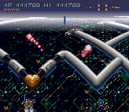Axelay takes after the philosophy of Life Force and Salamander, in that there are six stages in total, each alternating between side-scrolling and overhead perspectives. The catch with Axelay is that the overhead stages have been slightly skewed at an angle, somewhat similar to Silpheed. The landscapes scroll using a graphical effect which stretches the terrain, making it appear that you’re flying over the horizon. It may seem hokey now, but it was quite an impressive effect when it was introduced, and the use of multi-plane scrolling creates a uniquely fake impression of 3D.