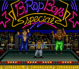 The storyline is typical of a lot of beat-em-ups of the time: defeat a crime boss and his henchmen. Although the game takes place in the same universe as DJ Boy, no characters return. You can now choose from three entirely different unnamed characters: one on a skateboard, the other riding a bicycle, and the last on roller skates, all clad in very 90s MC Hammer-esque trousers. Much like its predecessor, B. Rap Boys features both auto-scrolling and free-roam sections, with the scrolling being a lot faster and smoother than DJ Boy. The graphics have been improved with larger sprites, but have a lot less detail and animation than contemporaries like Teenage Mutant Ninja Turtles, The Simpsons, and the Capcom brawlers. The backgrounds look pretty good and have some nice variation, but there are far few too many different types of enemies, with just a few types of standard thugs and bosses repeated ad nauseum. This lack of diversity makes the game repetitive very quickly. It is also a pretty tough and often cheap and frustrating brawler, and some occasional glitches can cause problems, like the player not being able to turn to face an enemy and enemies sometimes getting stuck behind objects, making it difficult to continue.