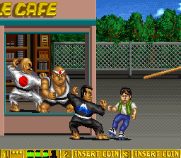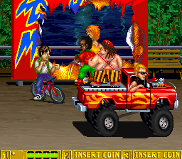 New to the series are weapons that both you and your foes can pick up, including baseball bats, pipes, bottles, burgers, and even a mech suit. Unlike some similar games, an enemy doesn’t need to be directly opposite you to strike with thrown objects, as they home in on your location. While adding to the gameplay, they lack variety to make things really interesting. There is also a new lifebar, although for some reason it is obscured by your score making it hard to read in the heat of battle. You gain an extra life by scoring between 1000 and 4000 points depending on the difficulty set via dip switches, although if it is set to very hard you’re out of luck – no extra lives are awarded, no matter how many points you score. The controls have also been refined – there is now one attack button and one jump button, although the number of attacks has increased, from punches and kicks to elbows to the head and throws. Jumping and then attacking unleashes a flying kick, and pressing both buttons together performs a special attack on your chosen mode of transport such as a kickflip/skateboard dropkick, and a Ryu-esque spinning kick or flying kick (at no cost to your health) if not. If you are knocked off your ride, you carry on wearing roller skates, getting a limited time to mount it again. Similarly to DJ Boy, you’ll be on the receiving end of a lot of pro wrestling moves, from gorilla presses to powerbombs to spinning lariats.