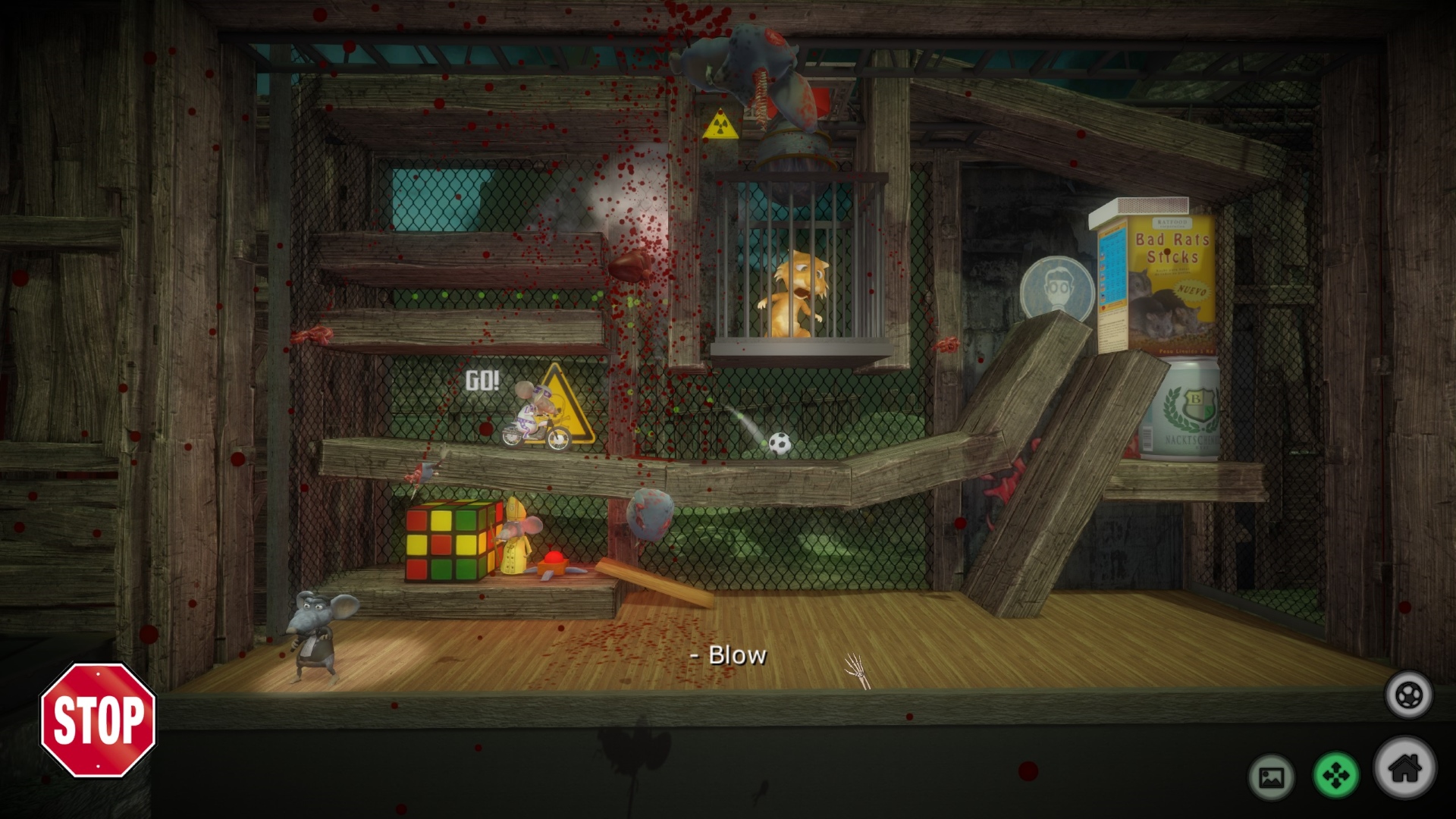 However, the game’s fatal flaw is in its physics, which is completely ludicrous for a game that’s entirely based around physics-based movement and should have been the developers top priority to get right. So what’s wrong with the physics exactly? It’s simple: they’re nondeterministic. When playing, there’s a noticeable degree of randomness applied to the amount of force on the ball when it’s hit by the rats or objects, and also randomness regarding when the rats get line-of-sight of the ball and activate. This is demonstrated easily when using Batter Rat, Lung Rat and especially Archer Rat. As a result, two separate runs of the same level can get wildly different results even if the timers, angles and positioning of the rats remain completely the same between attempts. It’s also possible for the ball to get stuck and roll towards the foreground and camera, even though the entire game is completely 2D regarding the rat and object positioning. Because of these flaws, it’s a game less of strategy and more of luck as you put your rats in the vaguely correct positions, start the level and pray that the game’s physics will work in your favor to active the trap. If not, then you’ll have to engage in tedious and fiddly trial-and-error work with the timers and rat positions, and just keep trying until you either luck out or give up. To finally hammer the point home, upon completing a stage the game will give you a chance to view the solution intended by the developers, but even these are at the mercy of the game’s wonky physics and will often fail randomly. It’s amazing.