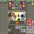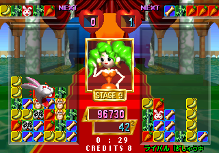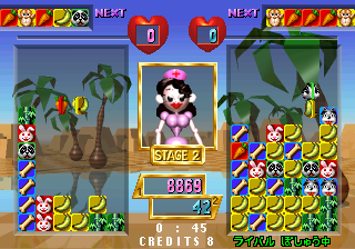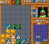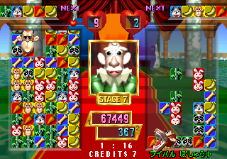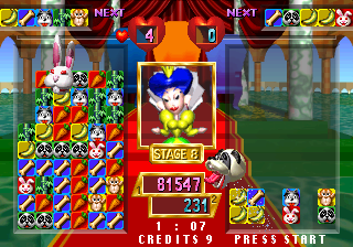 Much like other puzzle games in the falling block subgenre, the goal in Baku Baku is to create combos to clear out enough of the blocks on your side of the screen in order to fill up your opponent’s playing field with blocks. The twist here lies in how this is accomplished: rather than simply matching three or four pieces of the same color, players will have to match up animal blocks with the appropriate food blocks. There are four types of animals (dog, panda, rabbit, and monkey) and four types of foods (bones, bamboo, carrots, and bananas), and all it takes is one of each in order to create a match. However, matching up blocks one by one isn’t enough, since an animal will have to clear out at least three food blocks in order to send anything over to the opponent’s side. The blocks sent over to your opponent’s side aren’t the usual garbage blocks seen in Baku Baku’s contemporaries, but are instead just a random assortment of blocks, which can actually be more difficult to process in the heat of the moment. To make matching both easier and more dynamic, all connected blocks of the same type will be cleared out when an animal starts to eat them, so you can create lengthy matches going in all directions. This gives Baku Baku something of a unique metagame, where the standard strategies of other competitive puzzle games, such as creating sandwich or stair patterns, don’t work in quite the same way, forcing players to adjust those ideas and create elaborate, freeform patterns that can span a sizeable portion of the playing field. Interestingly enough, Capcom’s Super Puzzle Fighter II Turbo would go on to inherit several of Baku Baku’s ideas, namely the relationship between crash gems and regular gems that works in much the same way as the animal and food blocks in Baku Baku.