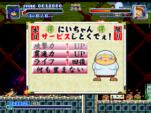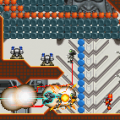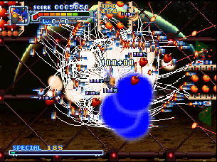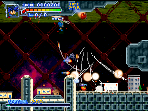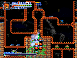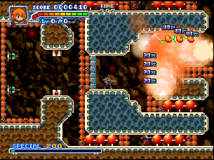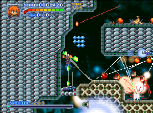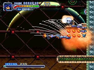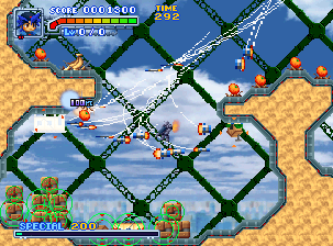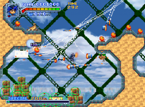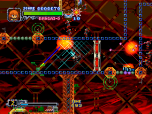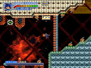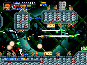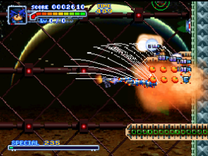 From a technical perspective, the Dreamcast version is also much better. Although the game is still 2D and runs in low-res 320×240, the backgrounds are significantly more detailed, and the sprites are a bit better looking too. Even the explosions look cooler. There are also many more tilesets in the Dreamcast version. Although most of the levels are structured the same in both version, the backgrounds may look completely different. (The only difference is Level 15, which was completely changed for the DC version.) The Dreamcast version also features higher quality remixed streamed versions of the songs versus the sequenced soundtrack in the N64 version, although neither are particularly great. The Dreamcast version features quick voices clips when taking damage, changing firing modes or using a super attack, as well as other additional sound effects. The Dreamcast version also has quite a bit less slowdown, although it’ll still crawl with the bigger explosions.