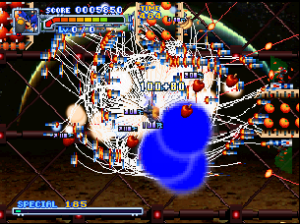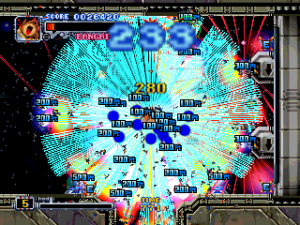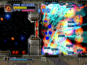Even more useful than your standard shot is the explosive mega attack. When you use this attack, it will send a number of missiles hurtling in every direction, effectively damaging everything on the screen. And this is the brilliant part – the amount of missiles fired is determined by the proximity of enemy fire. If you’re about to get grazed by an enemy bullet, your firepower will double. If you’re surrounded by bullets which are mere pixels from your ship, you’ll unleash an even larger number of missiles. And if you’re next to a flamethrower and enemies are everywhere and you’re mere milliseconds from getting completely annihilated, a well timed mega attack will trigger a beautiful explosion of 400 missiles flooding the entire screen. It’s an obvious tribute to the “Itano Circus” style of battle scenes – nicknamed after Japanese director, famous for Macross amongst other mecha anime – where dozens upon dozens of missiles fly haphazardly, weaving extensive webs of smoke trails.
