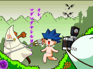 There’s a small difference in the Game Over screen between the territories. When you die and continue, you see a bizarre screen of a naked Riki being led through a garden by a ghost. It looks a bit too much like a Ku Klux Klan member in the Japanese version, so it was changed to a strange looking robot for the American version, and they put some clothes on the poor kid. The European version has the same screen as the Japanese one. The ghost has “N64” written on it in the N64 version, and “DC” (obviously) in the Dreamcast version.