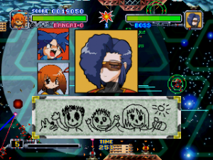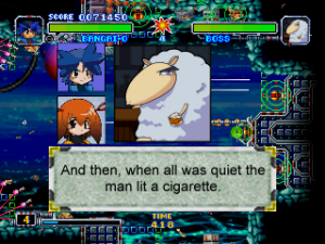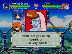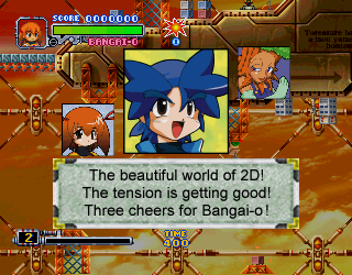 Before each boss encounter, Riki and Mami exchange dialogue with their enemy before fighting. Now, all of the Treasure games have had some kind of goofy sense of humor, but Bangai-O goes totally overboard with the ridiculous speeches. Riki is a nonsense talking goofball, loud and brash like traditional anime mech pilots in the days of old, but without much of a brain. Mami is soft spoken and generally stays in the background. The enemies are just as crazy – one is a sheep who loves to quote from hard boiled pulp fiction novels; another is an evil twin brother who’s jealous that Riki has starred in his own game; one speaks entirely in strange little doodles; and there’s a whole family called the “Core” gang (undoubtedly a reference to the cores found in most bosses in the Gradius series), a bunch of nincompoops who usually sit in place and do nothing. Part of the epic brilliance is due to the English translation, which is so awful it must’ve been intentionally done to emulate the feeling of classic 8-bit games. The writing regularly ignores traditional grammar rules as simple as punctuation and capitalization, yet there’s no part of it that isn’t extremely funny. Each dialogue exchange is also enhanced by the dim-witted background music, which seems to be saying that the game is just as confused by the absurdity as you are.