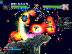 There’s an old saying that “big things come in small packages.” In Treasure’s Bakuretsu Muteki Bangai-O (“Explosive Invincible Bangai-O”, or simply Bangai-O in the English release), you control a robot, just dozen pixels or so in size, which can decimate an entire screen with a single, well-timed attack. It’s a love letter to both Japanese mecha shows (the name itself is a reference to a late 80s OVA called Dangaioh) and old-school computer shooters. Bangai-O combines this classic flavor with a healthy dose of clever game mechanics and fantastic amounts of wanton destruction, both Treasure trademarks.
