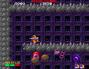 Baraduke focuses more on the shooting than the exploration, which is there but to a minimal extent as opposed to Metroid‘s huge interconnected areas. The goal of the levels is to find and destroy the Octy to open the stage’s exit, a pipe that leads to the next stage. When the Octy blows up, they leave behind a capsule that can randomly contain a score bonus, a gun power-up, a Paccet, or an enemy looking like a veiny, mutated purple Pac-Man. Well, it is a Namco game.