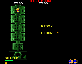 Baraduke is based on the hardware for Pac-Land and a video system derived from the one used for titles like Dragon Buster and Metro-Cross, that allows for pretty nice and detailed graphics for the period. The sound was handled by Yuriko Keino, who made things different than usual. Outside of the sound effects (including subtle stuff like the sound of Kissy’s steps on surfaces) and several brief jingles, there is no background music, only a continuous slow pulsing beat that becomes a bit faster when you are on our last shield. It actually adds to the subtle creepiness of the entire game, that however was phased out of the sequel, a more traditional horizontal shooter.