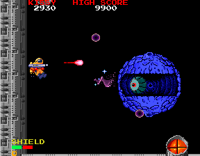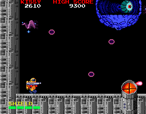 This is to be expected from a Namco arcade from the 80s, though: Baraduke is another brutally difficult game. Our spacewoman shoots at a fast rate, but only to the left and right, and there are no other weapons than the ray gun. The Octy are stationary, but they constantly spawn fast bullets and lesser enemies (some of which can shoot on their own), and sometimes they are placed at points that make them almost impossible to avoid. At times the game looks like a proto-bullet hell. Other aliens appear from nowhere and some of them have randomized movement patterns that make them hard to predict and avoid. There are just too many random factors, from the shield roulette to the capsules that must always be approached with caution, lest you get chomped to death. Also, Kissy’s invincibility time after a hit is almost nonexistent, and she can be destroyed in a couple of seconds. Plus, the machine’s default factory settings don’t even let you continue from the last level reached, forcing you to start from the beginning every time Kissy loses her last life.
