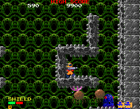 Baraduke also shares some similarities with Capcom’s arcade game Section Z that came out roughly at the same time. In both games the players control a free-range spaceman with a jetpack traversing a number of sectors scrolling both horizontally and vertically, with the difference that in Baraduke the player characters are affected by gravity and their gun’s recoil. (A bit of trivia about these characters: their names “Kissy” and “Takky” derive from the nicknames of Yoshihiro Kishimoto and Yukio Takahashi, respectively programmer and designer of this title)