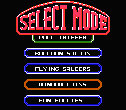 Designed for use with the Zapper light gun, Barker Bill’s Trick Shooting is a whimsical shooting gallery game. The player can choose from four mini-games- Balloon Saloon, Flying Saucers, Window Pains, and Fun Follies. Each game starts you with ten credits that decrease each time you miss a target. You can also gain credits (up to 99) by shooting diamonds that occasionally appear- a smart design choice since most other NES light gun games that use a hit/miss system don’t usually provide a way for you to redeem yourself.