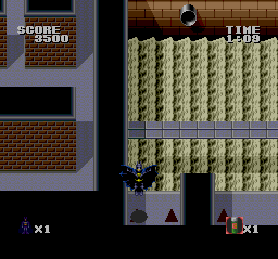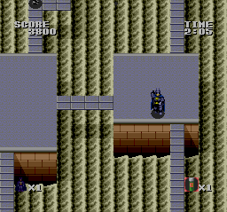 Batman’s only method of attacking is by standing in place and throwing batarangs, which can be pretty difficult. Whenever you lose a life, you lose any items you’ve gathered. Similar to Gradius, this leaves you moving at a hopelessly slow speed with only the most pathetic offensive capability. It can be nerve-wracking to waste time plodding around collecting power ups to do basic things like walk at a normal pace before attacking the meat of each level. Without the charming presentation of a Bomberman game and the expanded amount of tasks and larger levels, this gets very tedious.